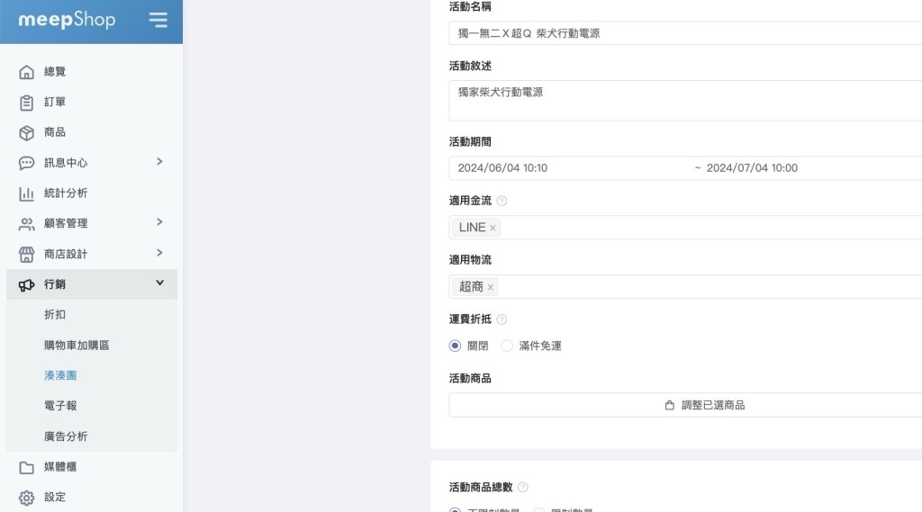 設定『湊湊團』團購活動 :獨一無二X超Q 柴犬行動電源。這邊你不僅可以自己設定團購的活動日期,通常我都喜歡設定14天~一個月。除此之外,金流和物流的選擇也很多,除了常見的GMO 金流、綠界科技這些最多人用的可以串接之外,還有LINE PAY。物流的話像黑貓、超商也都可以非常方便。