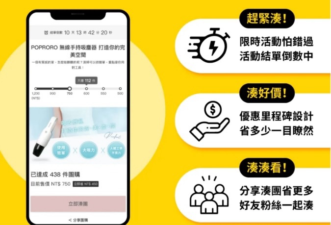 這樣就能快速透過「群眾團購」的方式達到用數量去跟老闆拿到優惠價。反觀這功能不僅可以讓小商家小品牌的電商網站,短時間內取得流量! 更可以降低顧客購買難度,讓顧客更願意入手,有效衝高銷量!